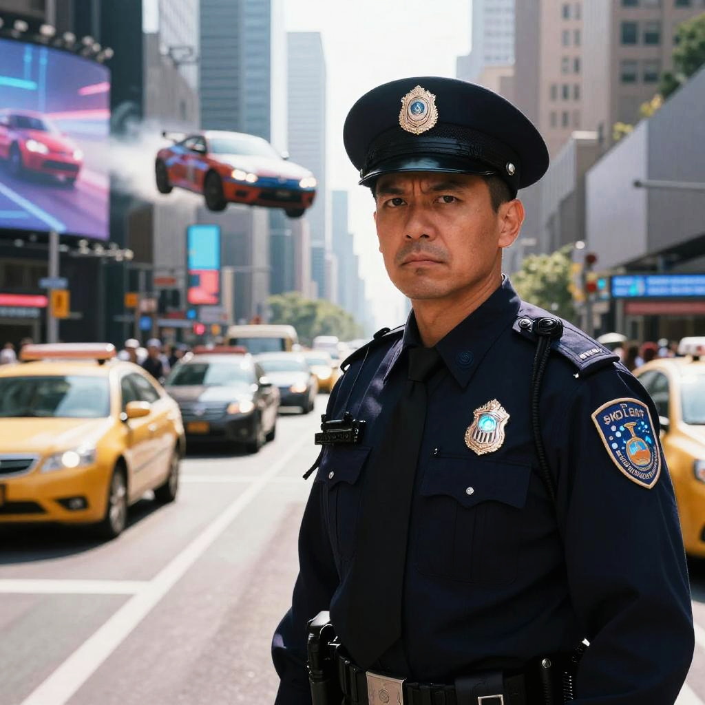 Photorealistic CGI of a stern male police officer in a glossy black uniform standing in a neon-lit, futuristic urban cityscape at dusk.