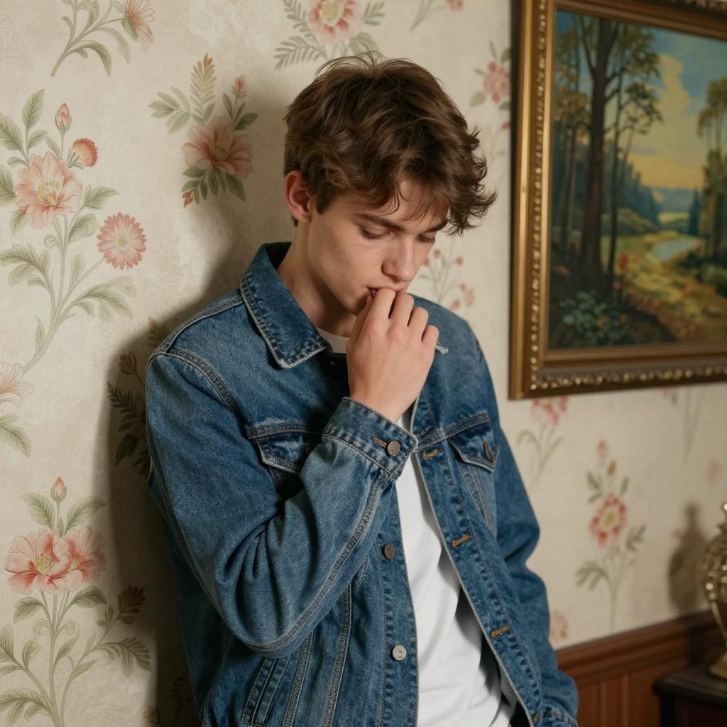 Young man with short brown hair, wearing a blue denim jacket over a white t-shirt, standing in a dusty, abandoned construction site. Metal roof structure in background, old houses and scattered debris. Man's head tilted slightly, serious expression. Clear blue sky. Grass and dirt ground. One person.