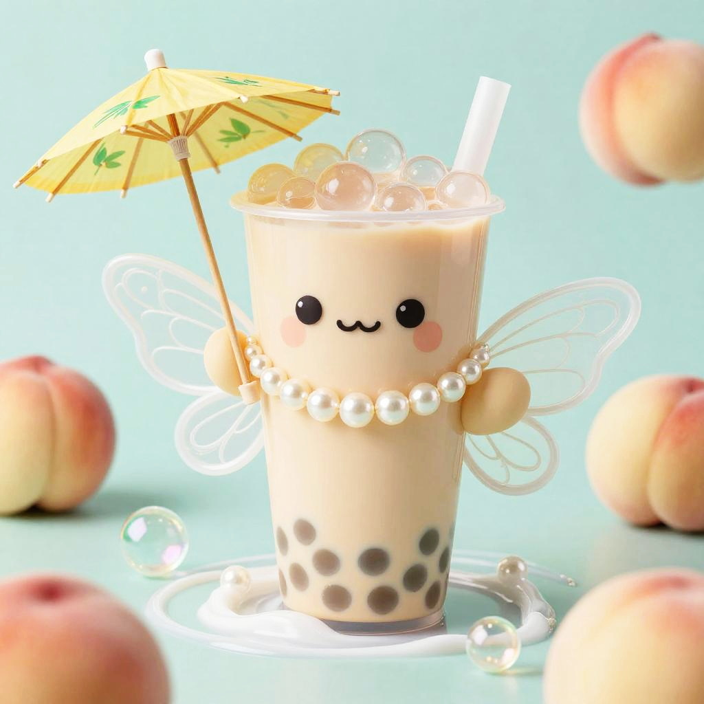 Kawaii cloud fox with cotton-candy tail, star-shaped freckles, tiny crescent-moon ears, pearl pink, baby teal, pale gold, soft colors, and dreamy atmosphere, floating lanterns and soft bokeh haze