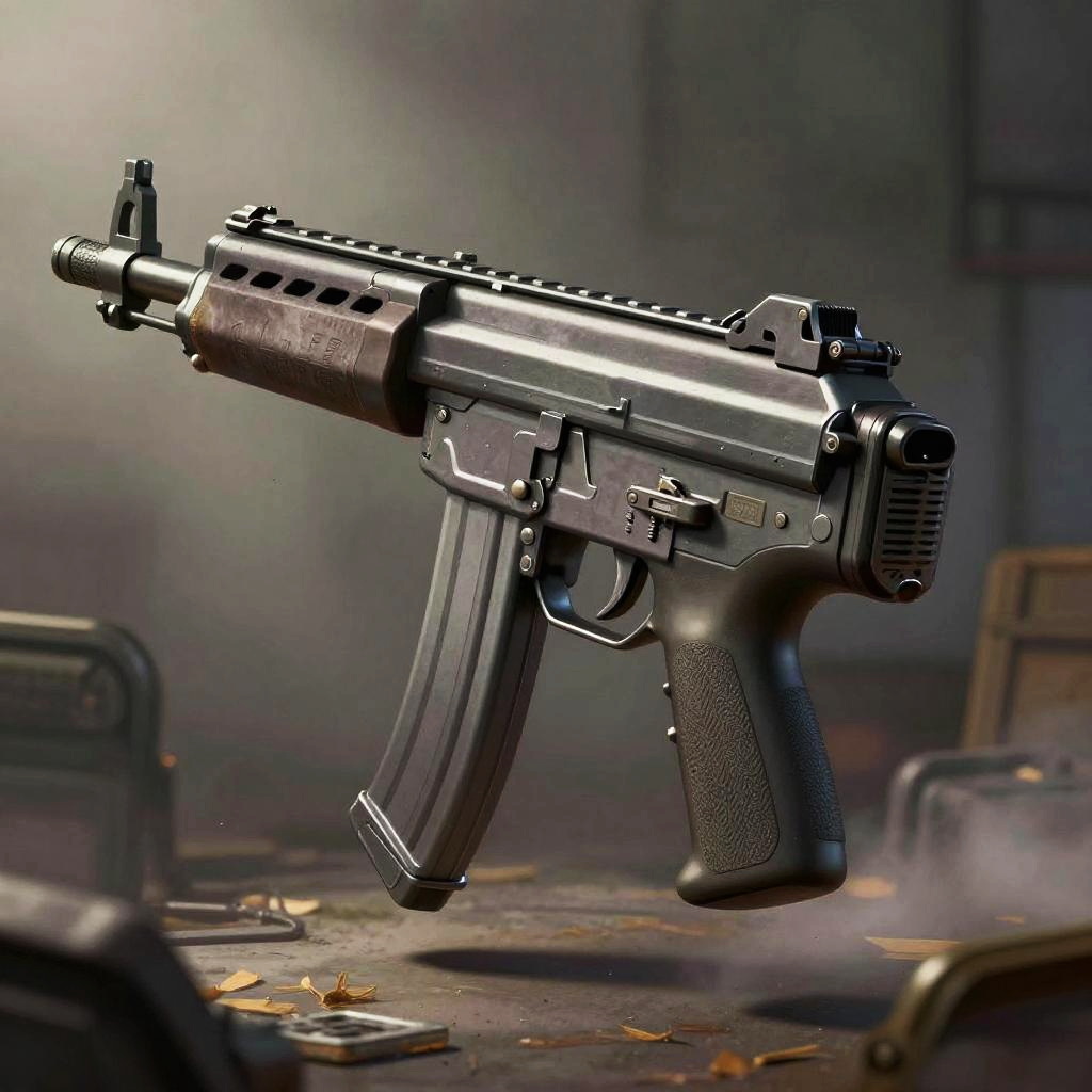 Detailed uzi profile picture illustration featuring a compact submachine gun with realistic textures and highlights, depicted in a dynamic angle, surrounded by smoky effects and a muted industrial background emphasizing its tactical nature.