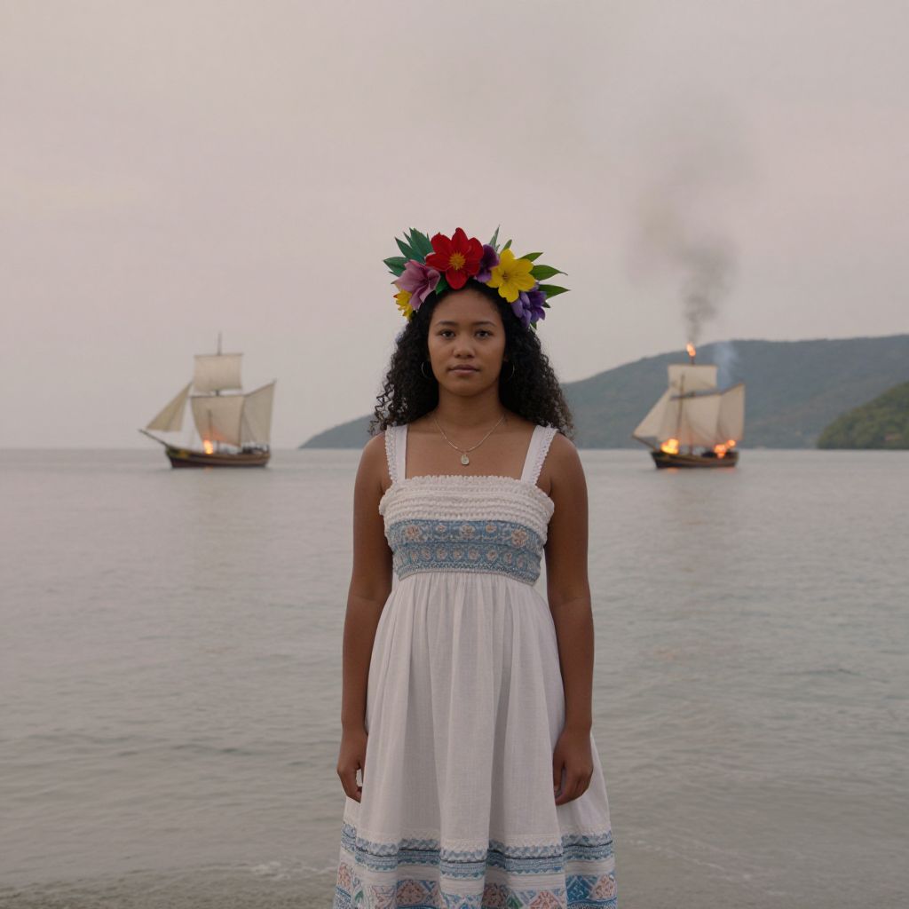 A young Polynesian woman in a Victorian dress and tropical flower headdress stands in a lagoon, with sailing ships burning in the distance and smoke rising from hills, all captured in a pastel color palette with a Wes Anderson panoramic cinematic style.