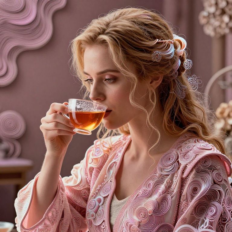 Specular Highlights Rachel from blade runner movie drinking tea ☕ ethereal filigree 8k topographic style,