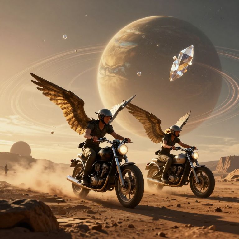 In a surreal, cyberpunk-inspired digital artwork, two winged figures ride motorcycles across a rugged, extraterrestrial landscape, navigating through the ethereal rings of a distant planet bathed in golden-hour light, as they harvest stardust from orbiting crystalline formations.