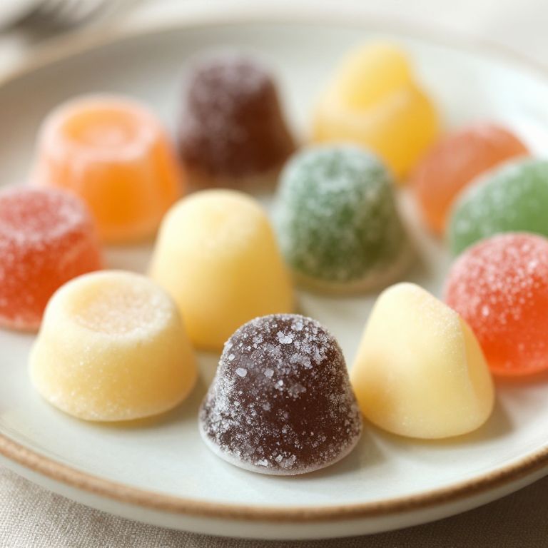 Close-up of marzipan candy bites, a variety of shapes and colors, soft diffuse lighting, showcasing the creamy texture and sugar-coated finish, arranged artistically on a vintage ceramic plate, evoking a cozy dessert atmosphere.