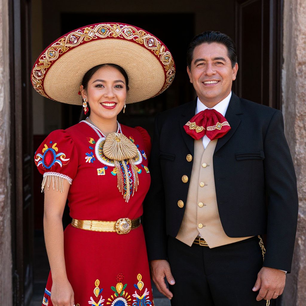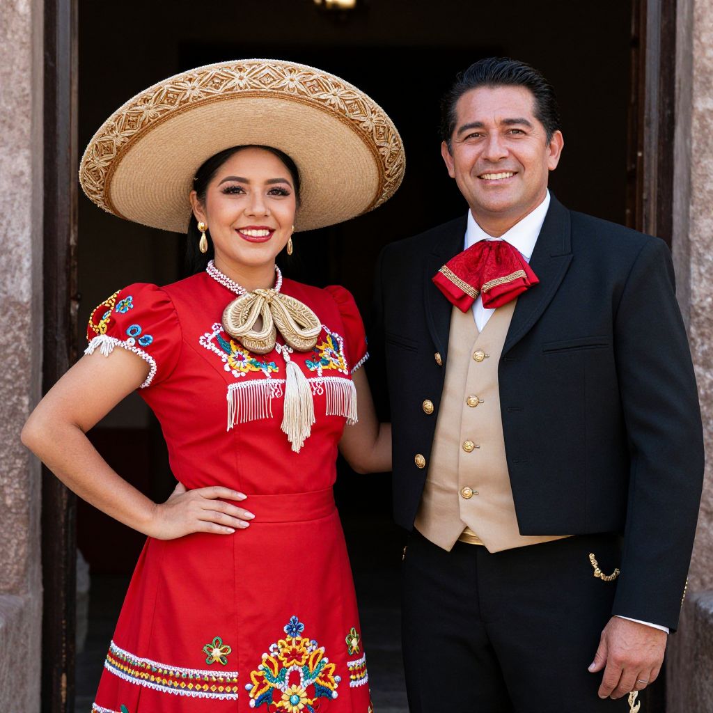 Man and woman dressed in vibrant Mexican traditional attire stand together, the woman wearing a wide-brimmed sombrero adorned with intricate embellishments and a red dress featuring detailed embroidery and fringe, while the man dons a black suit with gold buttons, a tan vest, a red bow tie, and a red flower boutonniere, both smiling warmly against a dark doorway backdrop.