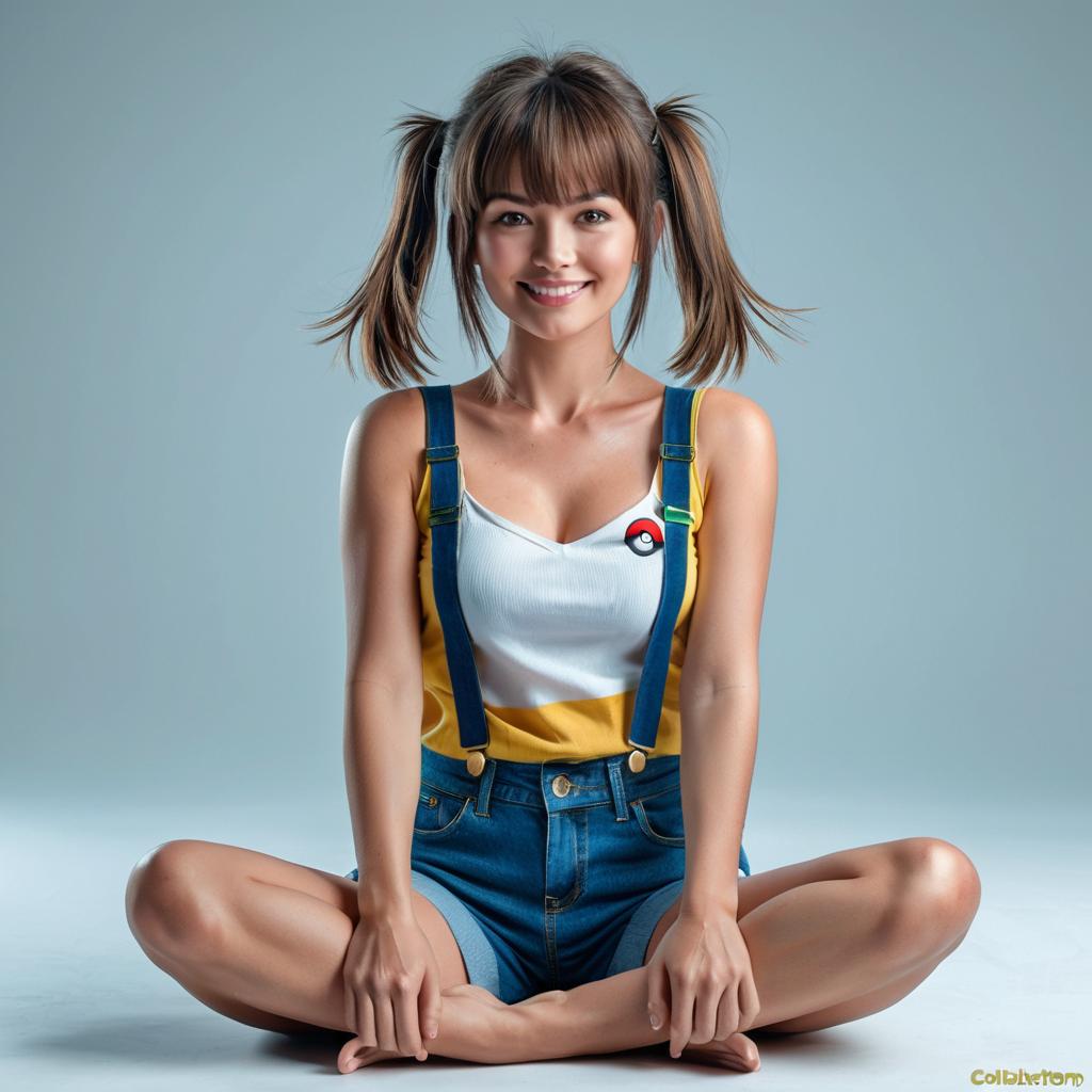 Beautiful, masterpiece, best quality, extremely detailed face, perfect lighting, 1girl, solo, green eyes, misty \(pokemon\), bangs, bare arms, barefoot, blue shorts, blush, breasts, collarbone, denim, full body, grin, hair between eyes, looking at viewer, shirt, short shorts, shorts, simple background, sitting, sleeveless, sleeveless shirt, smile, suspenders, white background, yellow shirt