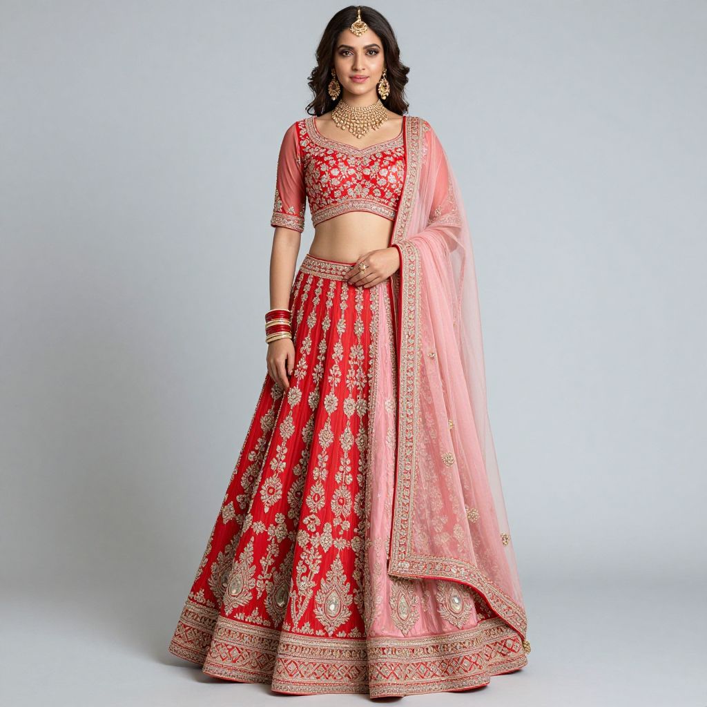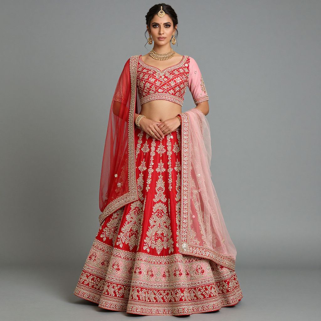 Photograph of a South Asian woman in a red and pink traditional lehenga with intricate gold embroidery, wearing a matching dupatta, jewelry, and a