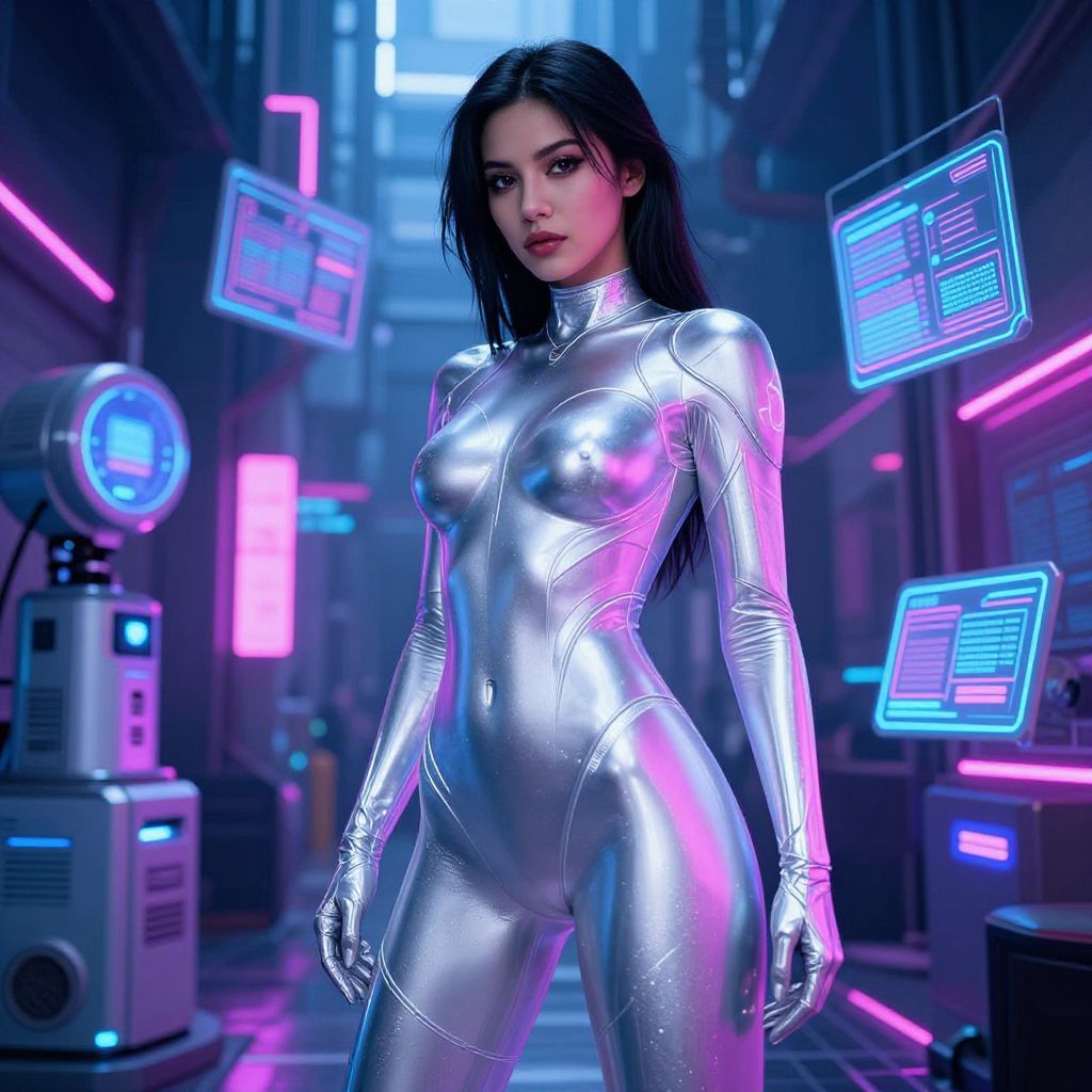 Cinematic, futuristic scene featuring a face-focused and body-focused close-up portrait of a mysterious stunningly beautiful slender female figure wearing a tight shiny revealing silver suit, The gorgeous figure stands in a serene, dream-like landscape surrounded by massive modern buildings, under a vast starry night sky, She has beautiful narrow face with flawless sharp model-like facial features and large captivating silver-blue eyes and iridescent blonde hair, surrounded by cyan geometric patterns, evoking an otherworldly aura, Her face shows and expression of awe and wonder, she has long eyelashes and elaborate makeup, rainbow lights surround her and reflect on her detailed perfect pale skin and shiny tight suit, she has a fit slender body and an impossibly small waist, perfect huge round bulging breasts, The figure stands poised adjusting a zipper at her ample bust, revealing deep cleavage, In the distant background, tall futuristic white marble and glass buildings and skyscrapers rise softly into a horizon with a gentle, ethereal glow, blue aurora lights the sky, enhancing the enigmatic atmosphere, soft lighting, HKMagic style, cinematic, vintage neon film, shallow depth of field