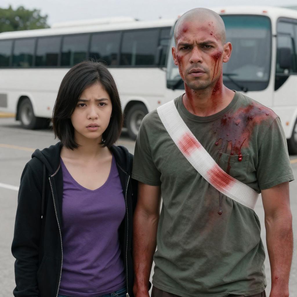 Photograph of a young woman with short black hair, wearing a purple top and black jacket, standing beside a bloodied, bald man in a green shirt with a white and red bandage across his chest. They are in a parking lot with two white buses labeled "ALURCA" in the background. The man has a serious expression, while the woman looks slightly concerned.