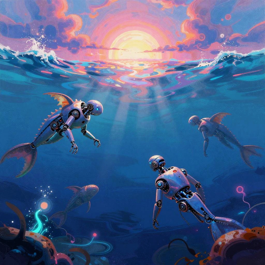 Surreal Neon Ocean with Robotic Sea Creatures