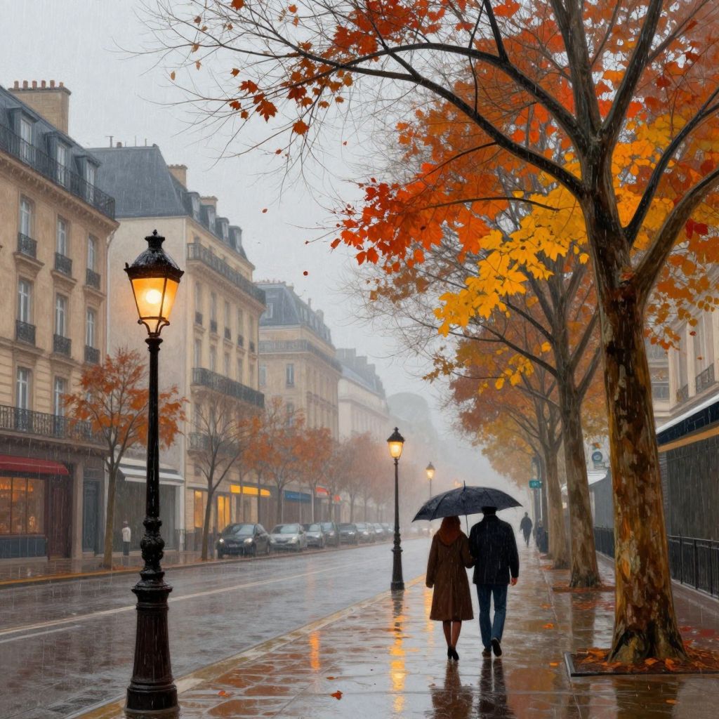 Rainy City Street with Blue Umbrellas
