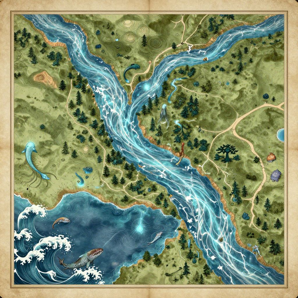 Fantasy map water portrayals showing dynamic, shimmering rivers winding through enchanted landscapes, with mythical sea creatures lurking near the shores, intricate wave patterns, and magical energy flowing across the water surface, all framed by a parchment map background, reminiscent of classic adventure tales.