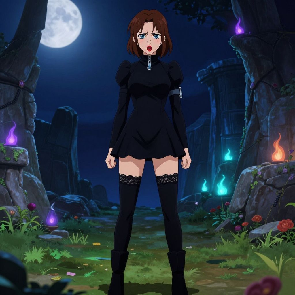 Source_anime, modelcloth, score_9, score_8_up, score_7_up, score_6_up, score_5_up, uncensored, prefect lighting, puffy shoulders, rating_explicit, very aesthetic, anime , (hd), (4k), detailed outline, best quality, 1girl, in a garden, head, red lips, intense eye contact, (mature_woman:1.2), cowboy_shot, ascot, juliette, sleeves, zipper, looking at viewer, blush, short hair, standing, feet, boots, shoe sole, open mouth, blue eyes, zipper pull tab, brown hair, thighhighs, long sleeves, dress, hair between eyes, parted lips, medium_breats, black thighhighs, medium hair, black dress, skindentation, fullbody, lace-trimmed legwear, arm belt, feets, potions, magic, moon, purple lights, aqua lights, decoration, rock wall, ruins, flares, floral_(theme), medieval_(theme), night_(theme), ray_tracing, cinematic lighting, landscape