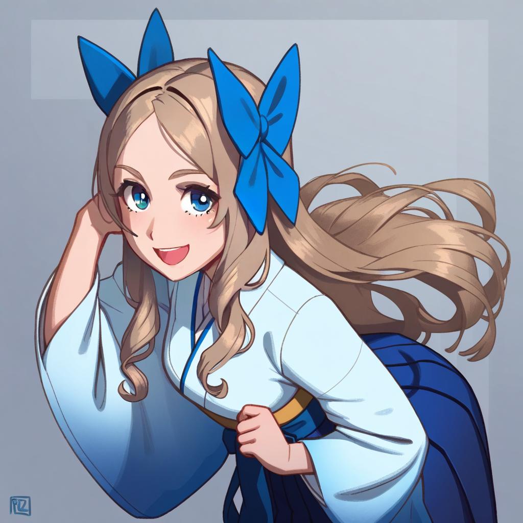 Asakaze (kancolle), kantai collection, 1girl, blue eyes, long hair, wavy hair, light brown hair, brown hair, parted bangs, sidelocks, hair bow, meiji schoolgirl uniform, meiji schoolgirl uniform, hakama skirt, blue bow, forehead, blue hakama, by artist riz, animagine