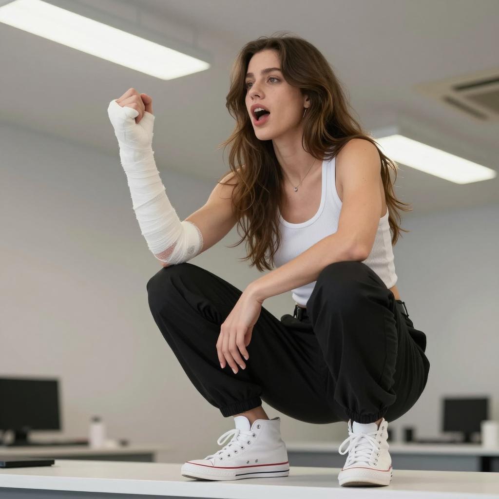 Woman with light brown hair, wearing a denim shirt, mid-action with right hand raised, mouth slightly open. Blurred head of another person in foreground. Background includes blurred books and light-colored curtains. Indoor setting. Photographic style.
