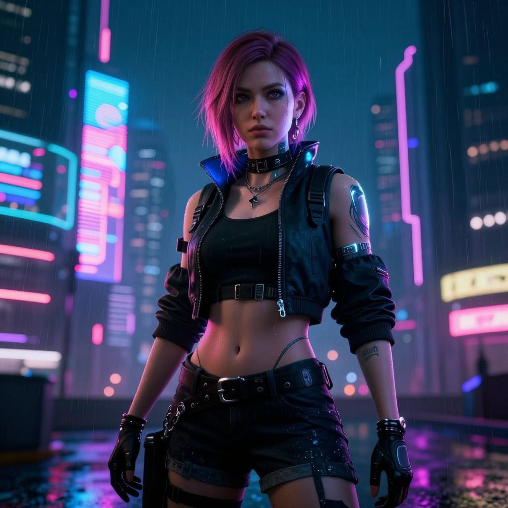 Cyberpunk cityscape at night, rain-soaked, neon-lit. Young woman with pink hair, black crop top, leather jacket, gloves