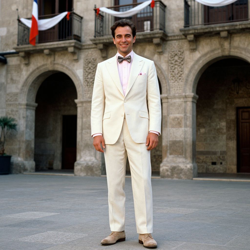 Photograph of a young man standing in a historic stone courtyard. He has short, dark hair and a light to medium skin tone. He is wearing a white, tailored, three-piece suit with a black bow tie, white dress shirt, and beige dress shoes. His expression is confident and he is smiling slightly. Behind him, there is an old stone building with arched doorways and balconies, adorned with red and white draped banners. The ground is paved with light grey stones. The lighting is natural, suggesting an outdoor setting during daytime.