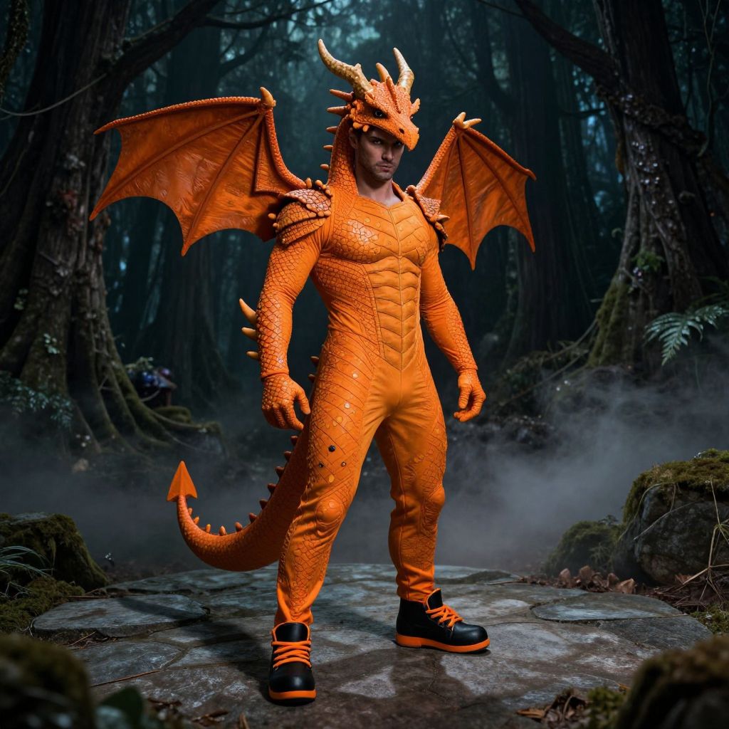A man in an orange dragon costume is standing on a stone surface. He is wearing a pair of black and orange shoes with orange laces. He has a muscular build, intense eyes, and a confident expression. The scene is set in a dark, mystical forest with fog curling around the stone surface. The lighting is dim, casting long shadows and emphasizing the dragon costume's detailed craftsmanship. The overall atmosphere is eerie and enchanting, with the man's presence commanding attention.