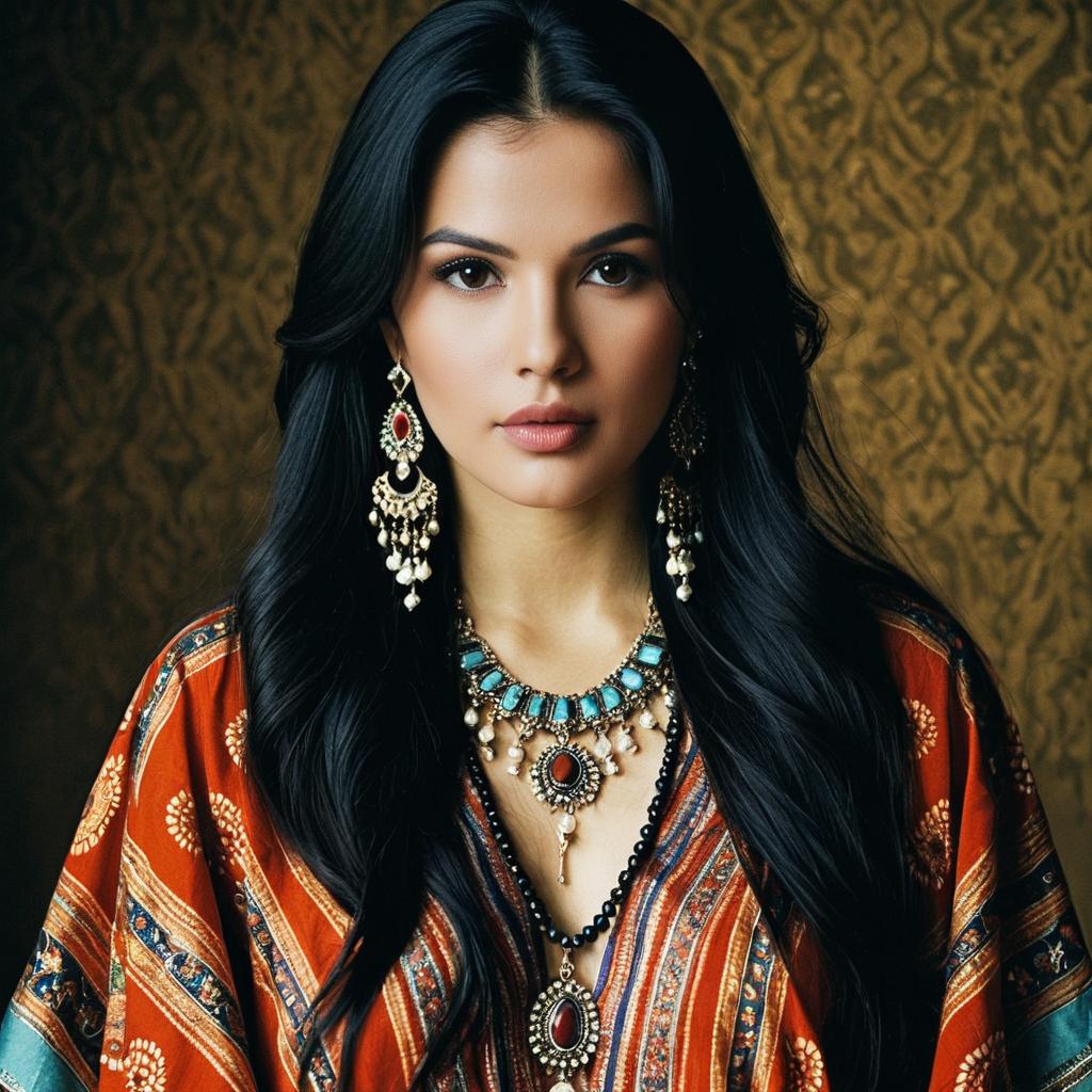 Portrait of a woman with long black hair standing against a brick wall. She is wearing a white sleeveless dress cinched with a wide black belt featuring a large ornate buckle. The woman is adorned with elaborate black and gold jewelry including long dangling earrings, layered beaded necklaces, and a statement necklace. She looks directly at the camera with a confident expression.