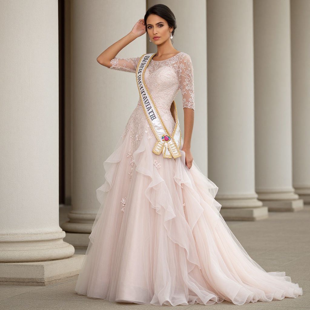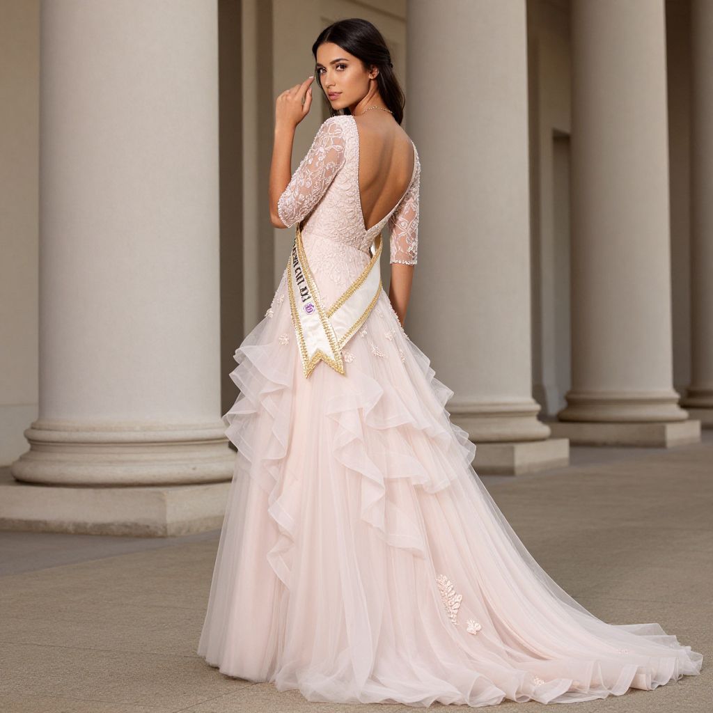 Photograph of a slender woman with dark hair in a sleek updo, standing against a backdrop of white columns. She wears a full-length, sheer lace and pink tulle gown with three-quarter sleeves and a ruffled, layered skirt. A sash with the text "Miss Universe" in blue and white is draped diagonally across her chest. She holds her right hand to her head, and her expression is poised. The background is brightly lit, highlighting the elegance of her dress and the columns. The image has a soft, natural light.