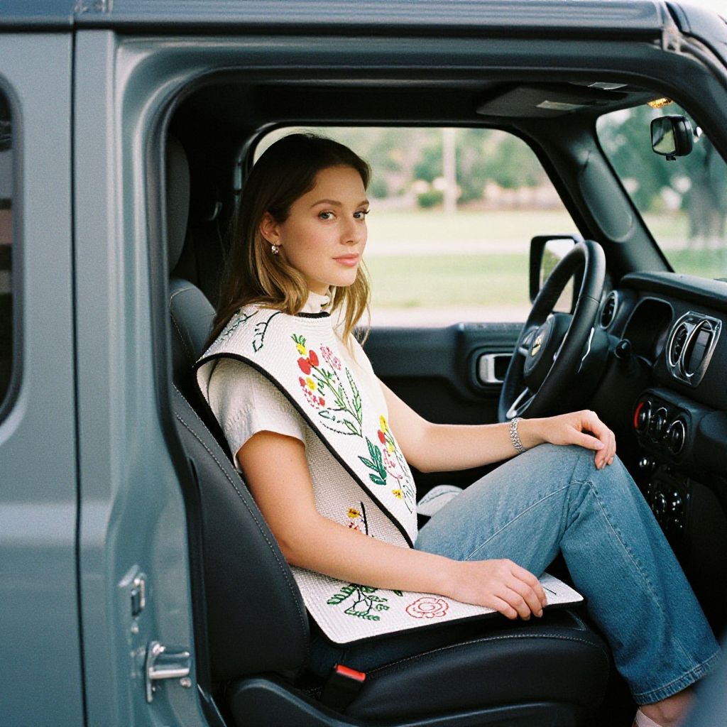 Embroidery Stabilizer beautiful woman sitting in the passenger seat of jeep wrangler + film grain, Leica 50mm, Kodak portra 800,