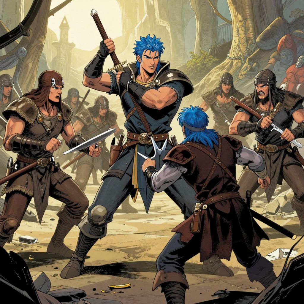 Digital comic-style artwork: Muscular blue-haired warrior at center, surrounded by armed, armored enemies in forest clearing, ready for battle. Bright sunlight filters
