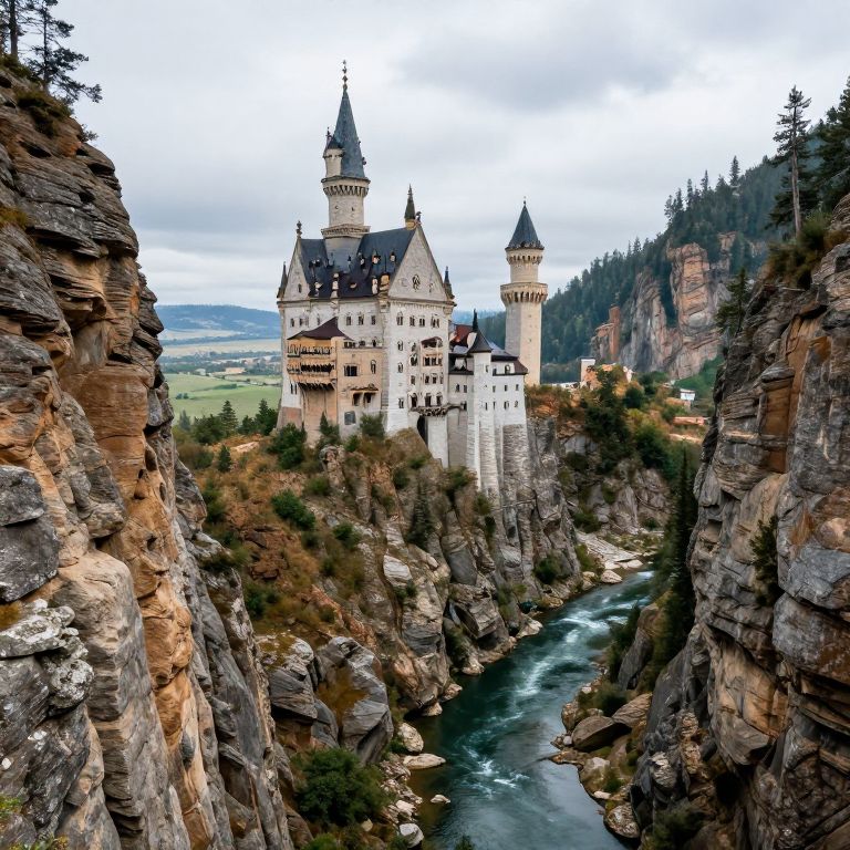 Photograph of a majestic, white, medieval-style castle with multiple tall, pointed towers perched on a rugged cliff overlooking a turbulent river. The castle has dark grey rooftops and is surrounded by rocky, forested cliffs. In the background, a lush green valley stretches under a cloudy, overcast sky. The castle's architecture is intricate, with multiple windows and small balconies. The river below is fast-flowing with whitecaps, carving a narrow path through the rocky terrain. The overall scene is dramatic and picturesque, evoking a fairy-tale atmosphere.