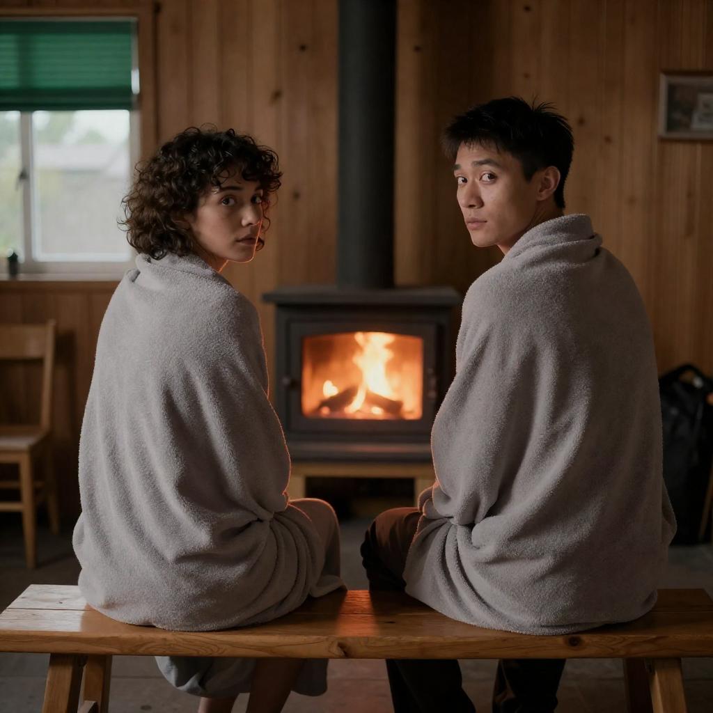 Photograph of a man and woman sitting on a wooden bench, wrapped in gray towels, facing a lit wood-burning stove. Both look toward the camera with intense expressions. Wood-paneled walls, green window shade, chairs, and a black bag in the background. Firelight illuminates their faces. Woman has short, curly hair; man has short, dark hair.
