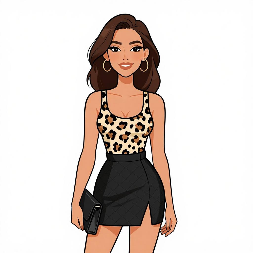 Woman with pretty face and pretty hair. smiling Woman, casual, leopard print tank top, scoop neck, black asymmetrical skort, quilted texture, minimalist black clutch. --sref 1467