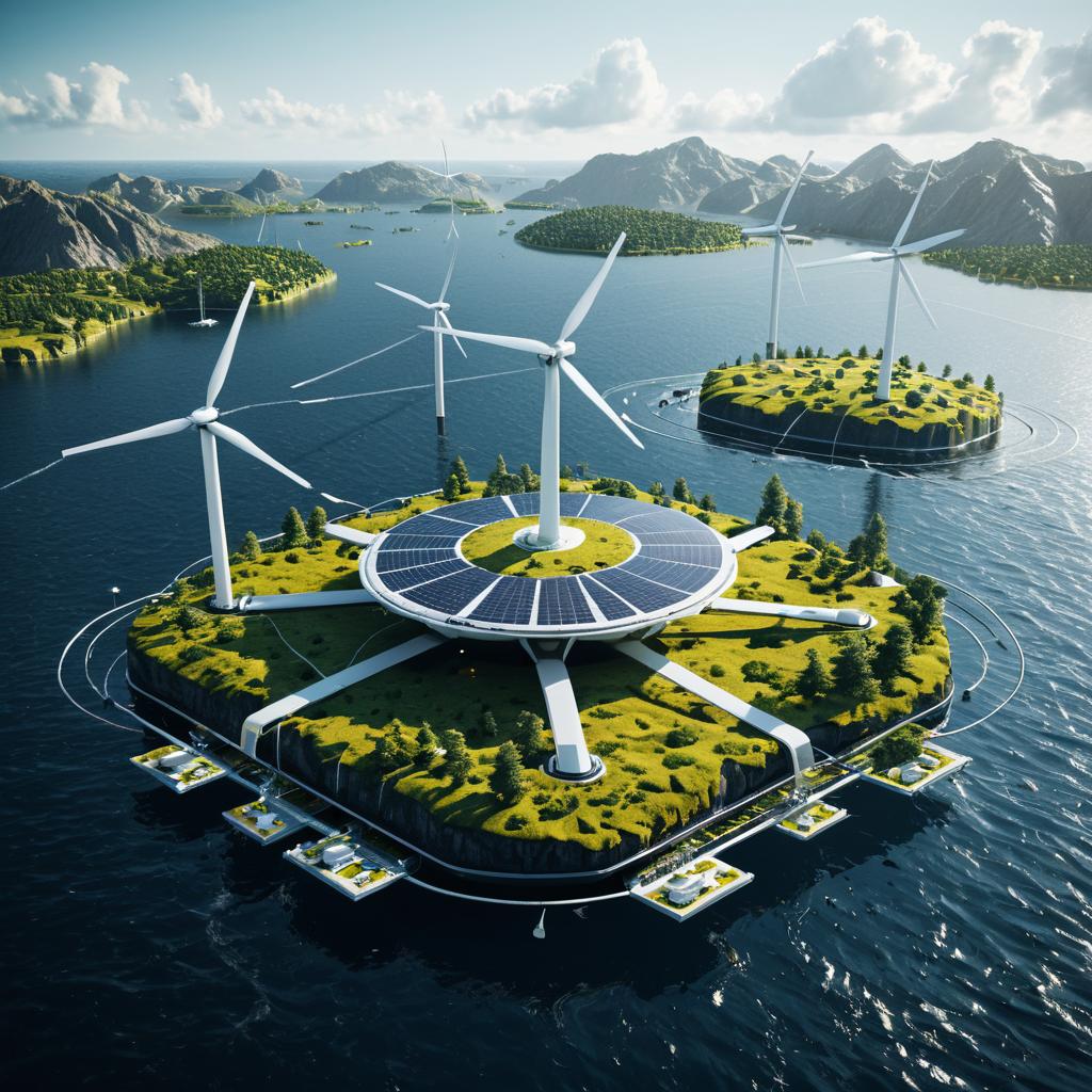 Floating island with renewable energy-powered anti-gravity systems, high-tech infrastructure, renewable energy sources, ultra-detailed, 3D rendering, dynamic lighting
