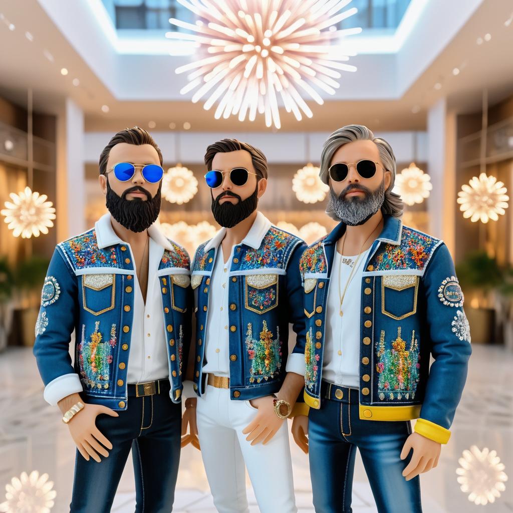 Fireworks three (2 German, on of them older with beard and 1 from Kazachstan) fashionable funko pop wearing jeans jackets and illuminated XR Smartglassesin highly detailed contemporary shot of a white boho hotel lobby with lots of natural lights with sveral interesting ornaments full of atmosphere,