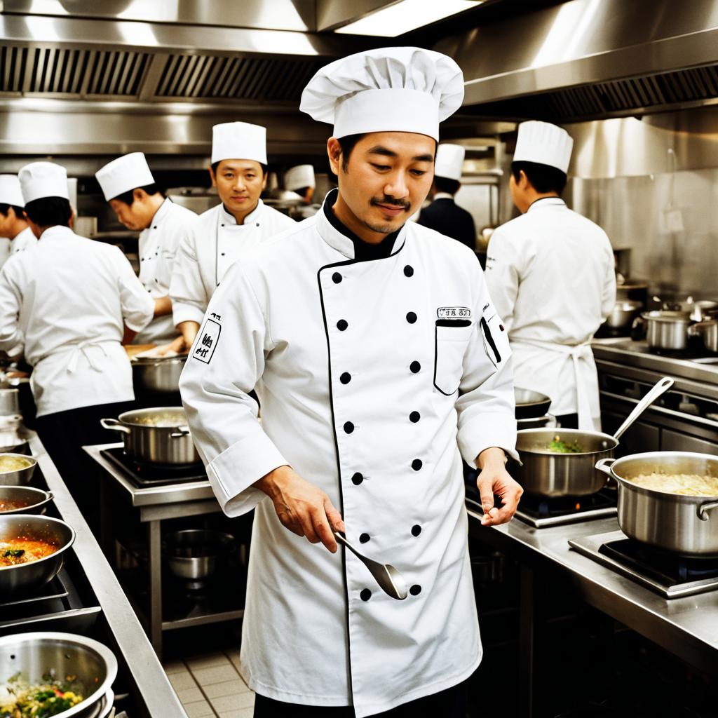 Asian male chef wearing a traditional white double-breasted chef coat and toque stands confidently in a busy restaurant kitchen. Multiple pots simmer on stovetops around him while other chefs work in the background. The kitchen is stainless steel and professionally equipped, indicating a high-end culinary environment.
