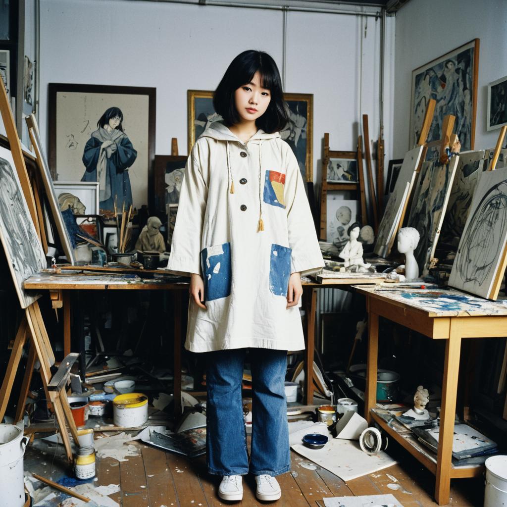 A seasoned chef, wearing a traditional white chef's coat and toque, standing in a bustling restaurant kitchen with simmering pots, expressing pride, illustrated in the elegant and classic manga style of Toshiko Ueda.