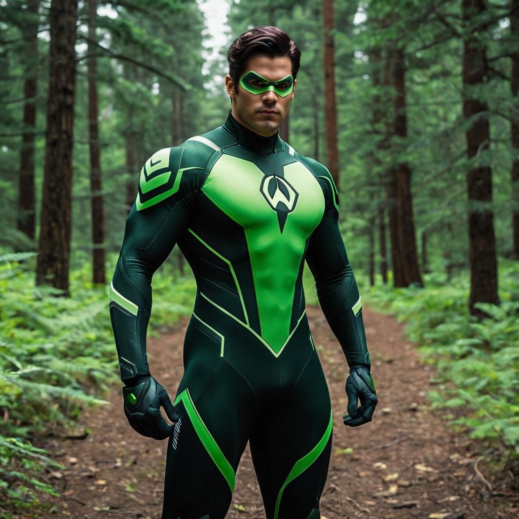 Shego male fancy dress, photorealistic, male superhero, standing, forest background, green and black tight suit, muscular build, dark brown hair, serious expression, CGI, forest path, daytime, detailed ures, sci-fi style, Symmetra from Overwatch, high detail, realistic lighting, confident stance