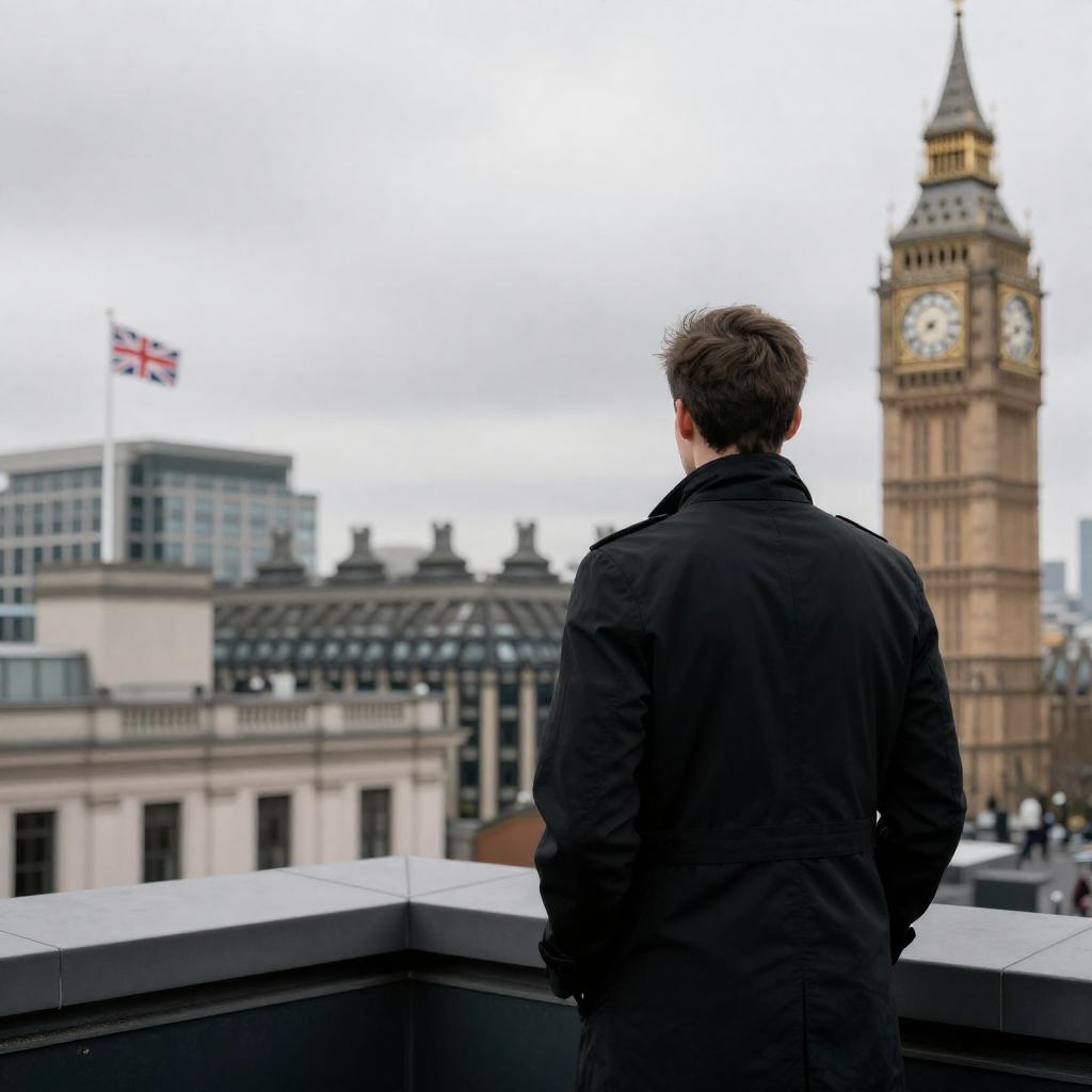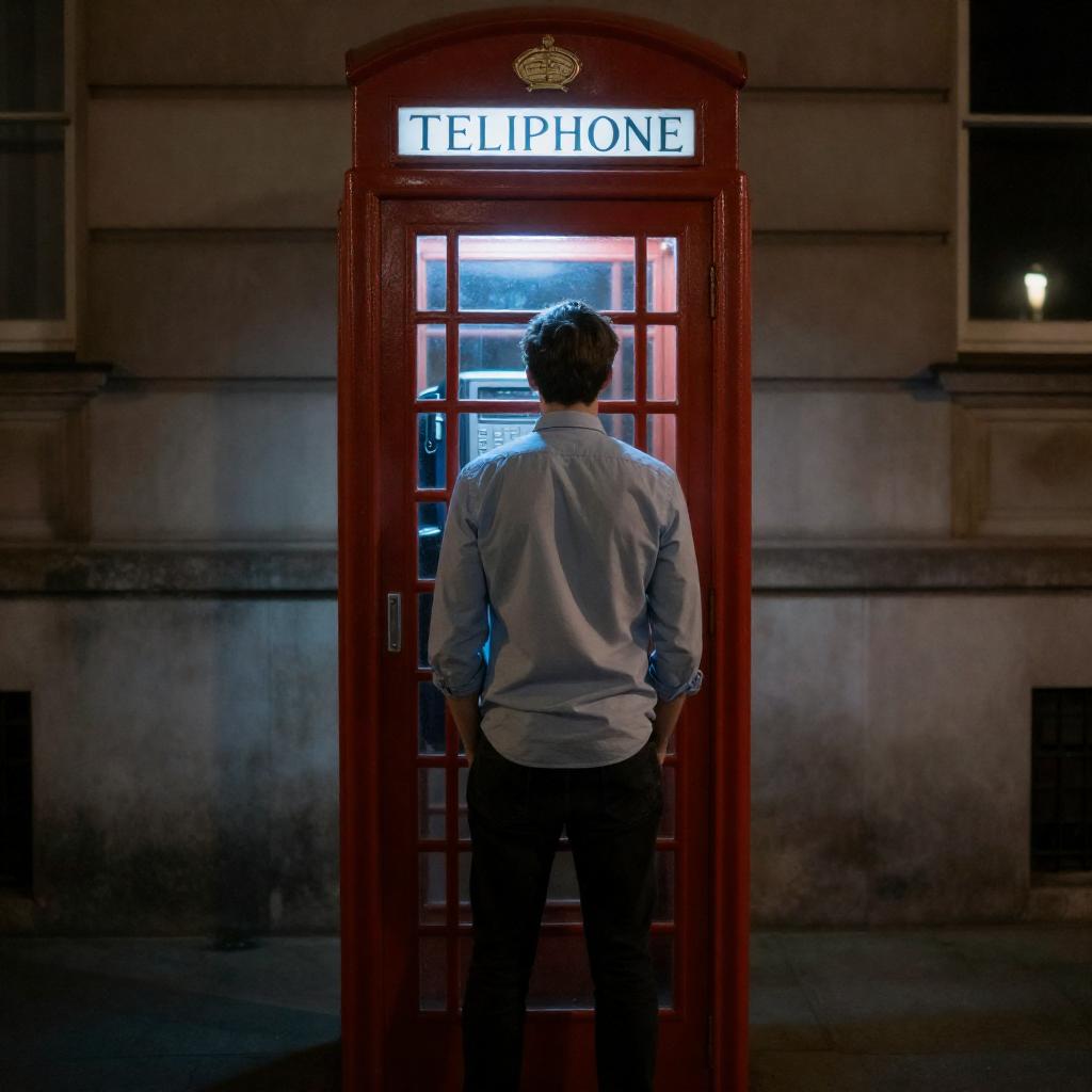 Photograph of a man with short brown hair, light blue shirt, and dark pants, standing in front of a glowing phone booth at night. The phone booth is illuminated, showing blue interior light. Background: darkened building with white and brown walls, one window with light inside. Man's face is not visible.