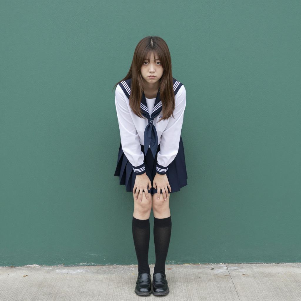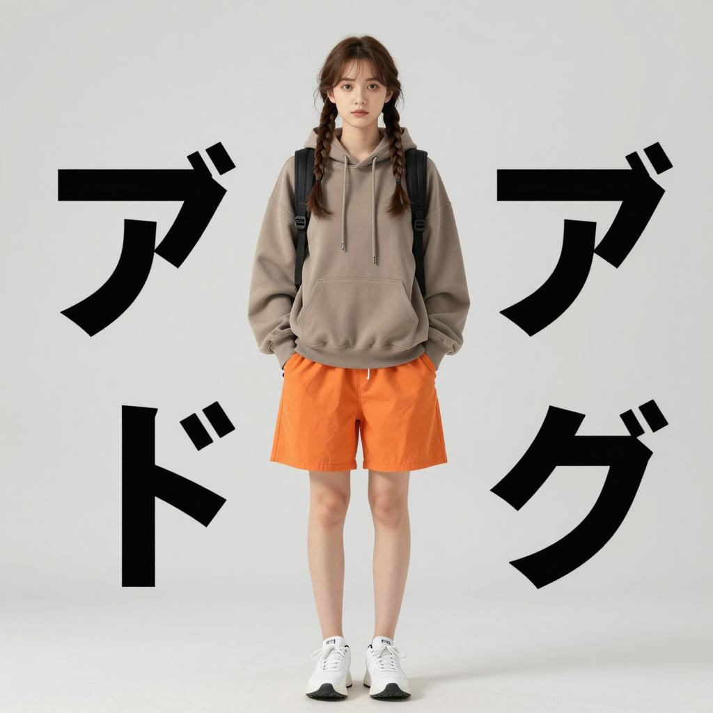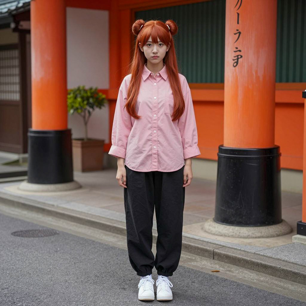 Adult ichigo costume, photorealistic, young Asian girl, long red hair, two buns, pink button-up shirt, black baggy pants, white sneakers, standing on street, daytime, traditional Japanese architecture, orange pillars, green plant in background, vertical sign with Japanese characters, serious expression, casual streetwear, urban setting, realistic shadows, natural light
