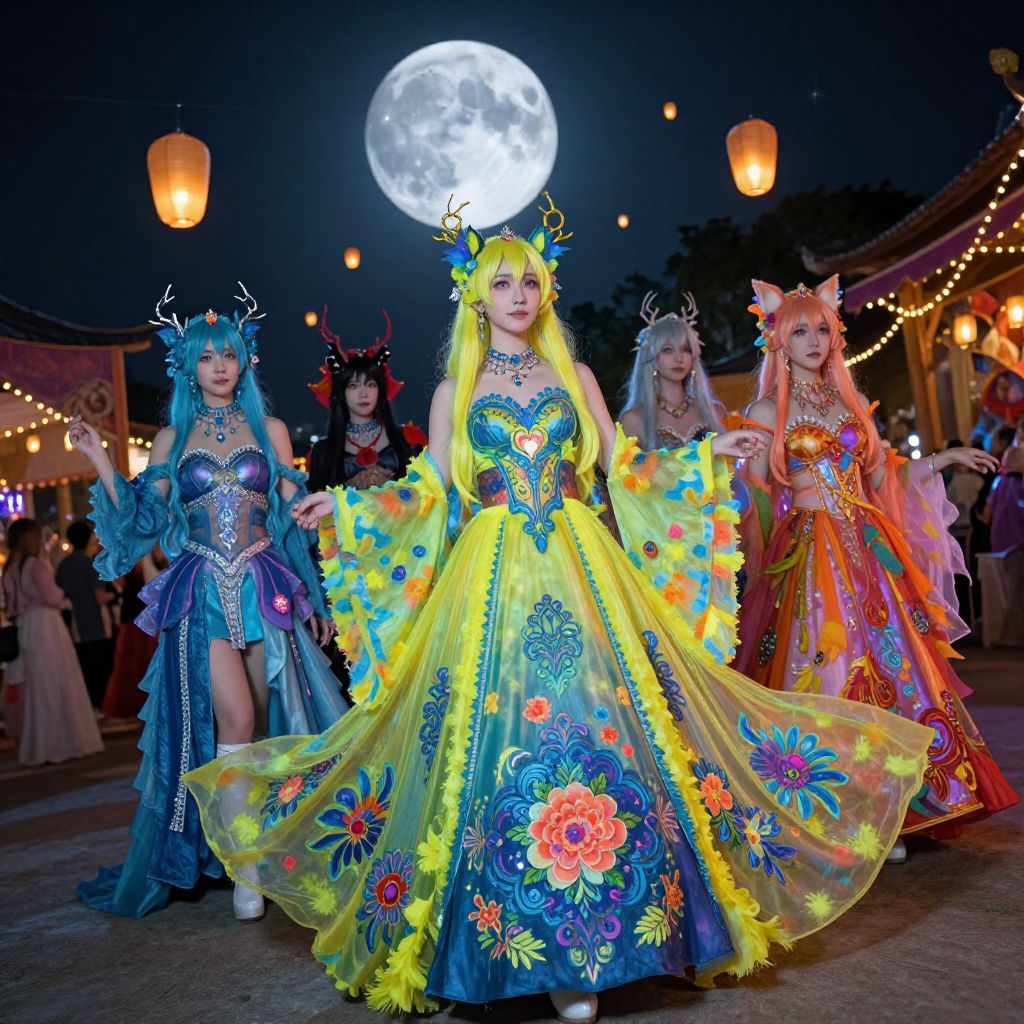 Pheromosa cosplay at a mysterious underground festival, flowing neon-dyed costumes, intricate floral patterns, moonlit environment, floating lanterns, mystical ambiance, vibrant colors, rich details, photorealistic style, Flux style