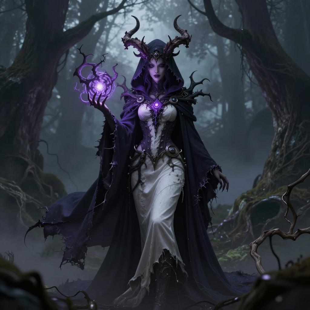A dark fantasy digital artwork of a twisted sorceress standing in an eerie, misty forest at twilight. The female figure wears a flowing cloak with tattered edges and a hood adorned with twisted antler-like horns. Her outfit features dark purple and white tones with intricate metallic embellishments and a glowing pendant. She holds a glowing magical orb in one hand, surrounded by twisted tree branches and shadowy silhouettes.