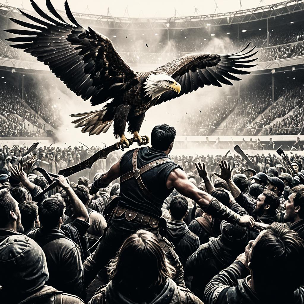 Realistic photo.a male ranger battling an eagle in an arena with a crowd watching. Rendered in detailed pencil art with ethereal art style, soft lighting and intense expressions.