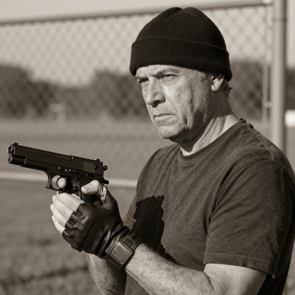 Sepia-toned image of a middle-aged man wearing a black beanie and dark t-shirt. He is holding a handgun with both hands, wearing fingerless black leather gloves. The man has a focused and determined expression on his face. Background features a blurred chain-link fence and outdoor setting with soft shadows.