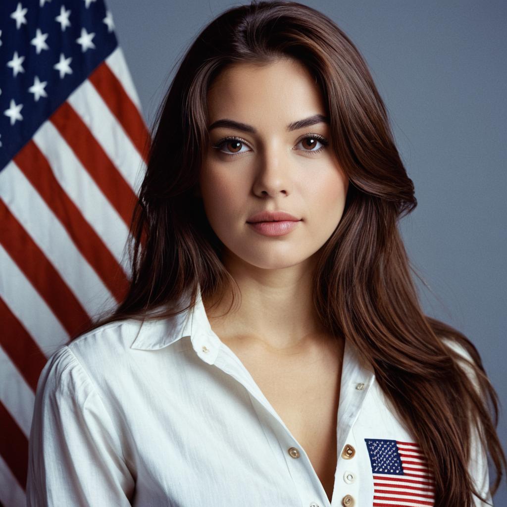 Portrait of a young woman with long brown hair and brown eyes wearing a white shirt featuring an American flag patch. She is posed in front of a blurred American flag background, looking directly at the viewer with a neutral expression. The shirt has rolled-up sleeves and visible buttons.