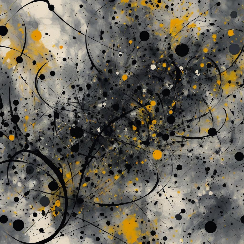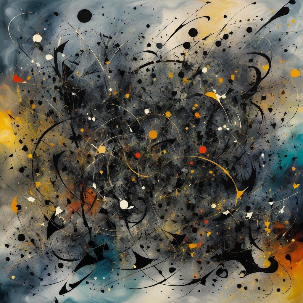An abstract painting featuring a chaotic blend of dark and light shades with swirling lines, dots, and splatters. The artwork uses a mix of black, yellow, blue, and white tones with dynamic curves and textured layers, evoking a sense of disorder and energy inspired by Jackson Pollock's style.
