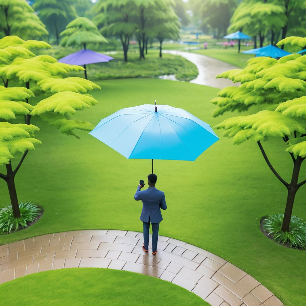 Drone shot of a man standing on a curved paved path in a vibrant green city park. He holds a large blue umbrella and a small black card, facing away from the camera towards the lush trees and open grassy area. The scene is bright and peaceful with multiple colorful umbrellas visible in the background along the winding walkway.
