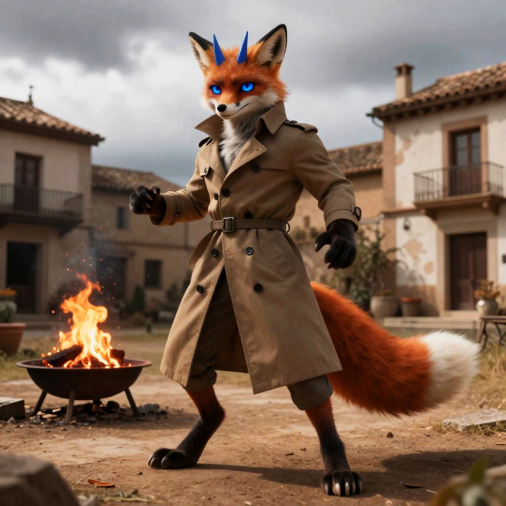 Solo, male, (athletic:0.7), (slim:0.8), (lean), secret agent, fox, (defensive action pose):1.3, (kemono:0.2), trenchcoat, ((clothed)), detailed eyes, large tail, horns, ((bust portrait)), (detailed eyes, blue eyes, glowing eyes):1.1, (outdoors:1.35), altar, village, Spain, old decrepit buildings, autumn, firepit, overcast, (grey sky), day time, sun rays, (particles, firefly, red glowing):1.3, detailed background, photorealistic, realistic hands, 8k hd, (dark shadows, wide dynamic range, hdr), by (by Pino Daeni, (by ruaidri), by virtyalfobo), (best quality, masterpiece:1), furry scalie male anthro vergence, lizard, smooth body, blue teeth, wide-eyed, (dynamic angle), blue nose horn, blue ribbed eyebrows, detailed blue eyes, blue chin spikes, chin frills, spines, blue spikes going down back of neck, (detailed pupils)
