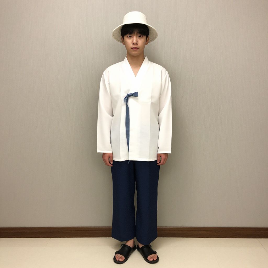 "simple homemade costume, 1boy, solo, male focus, hat, standing, indoors, black hair, full body, looking at viewer, sandals, closed mouth, long sleeves, korean clothes Realistic photo of casual sexy person with pretty face"