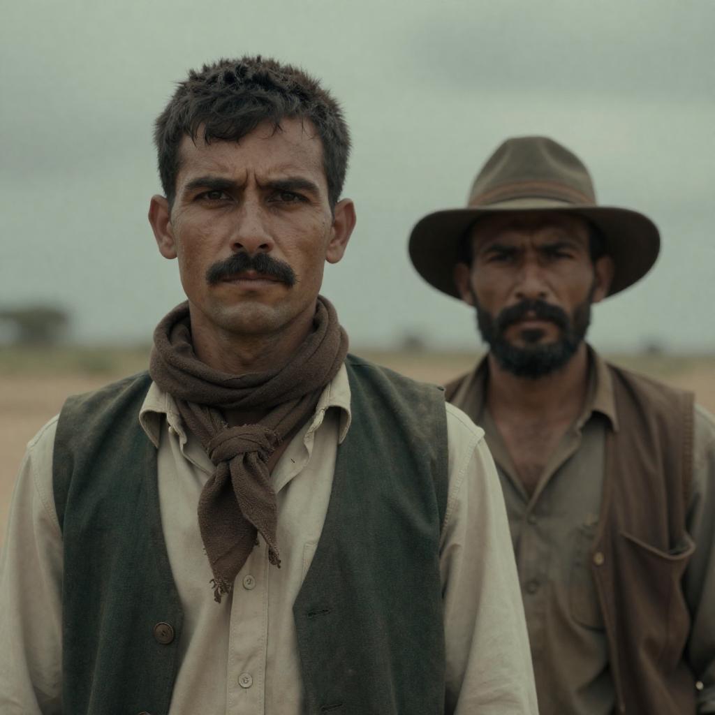Photograph of six men in gray prison uniforms and flat caps. Central black man with intense expression, white tank-top man with muscular build, cigarette-smoking man on left. Background: green field, wooden fence, trees. Group standing, looking forward.
