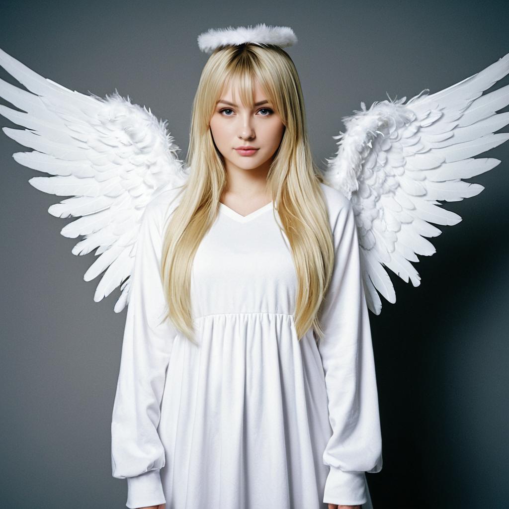 Angel kigurumi costume,solo, wings, 1girl, angel wings, long hair, blonde hair, angel, feathered wings, white wings, looking at viewer, long sleeves, dress, white dress, realistic
