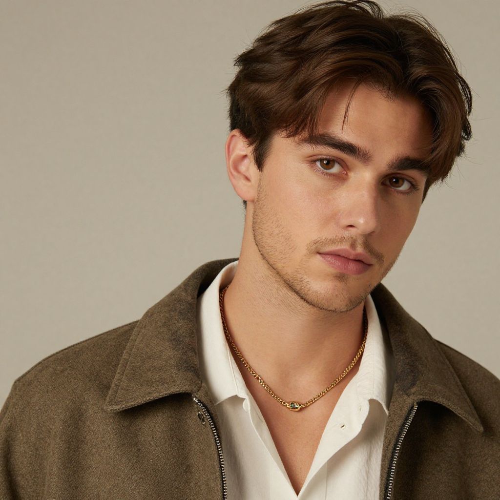 Photograph of a young man with dark hair and intense gaze, illuminated by warm light, with an orange and black butterfly perched on his shoulder,