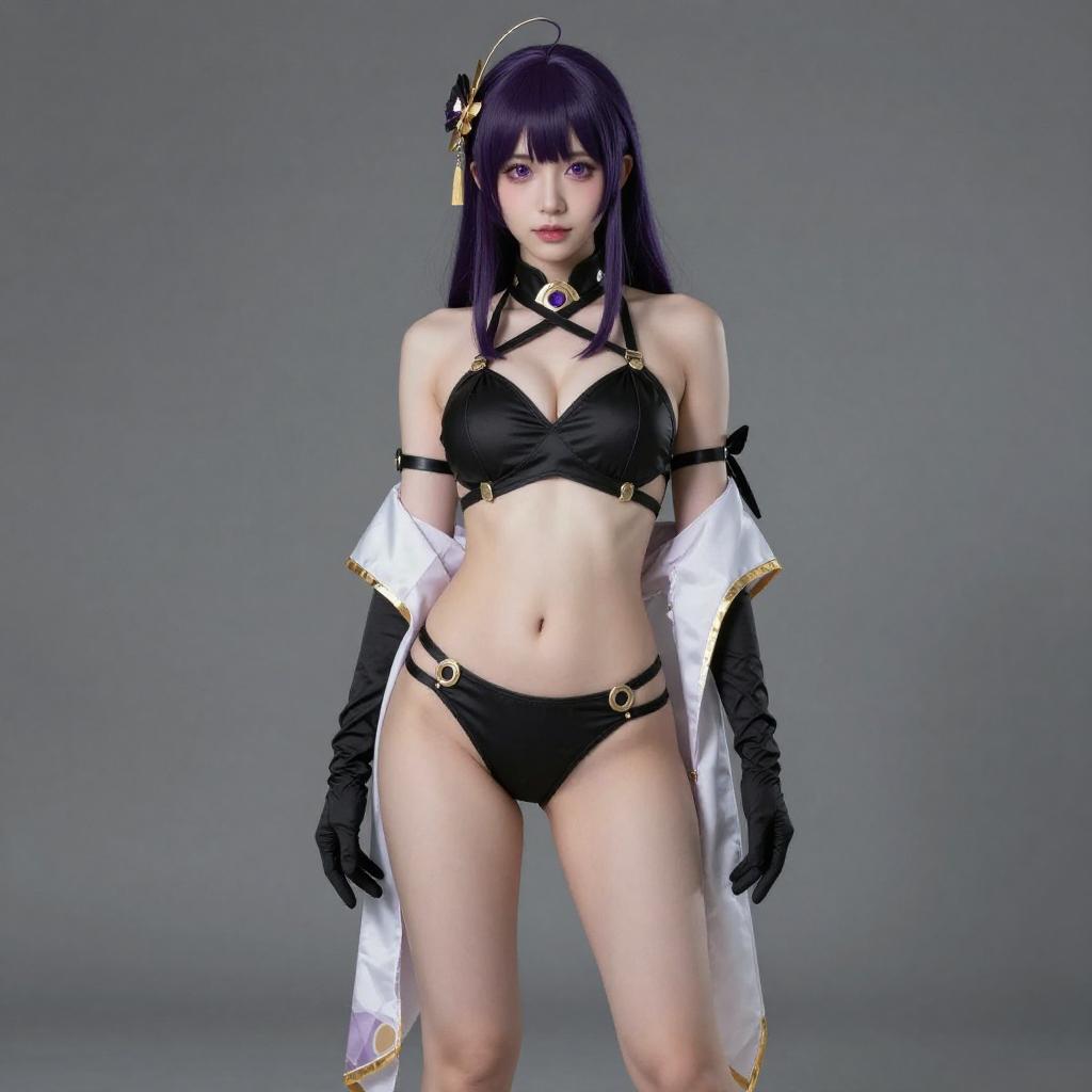 Photo-realistic cosplay photo of person in murasaki shikibu (swimsuit rider) (first ascension) (fate) costume. Full body. Standing. Full length. 1girl, purple eyes, long hair, purple hair, tied hair, black hair, hair flower, large breasts, thighs, covered navel, black one-piece swimsuit, highleg swimsuit, half gloves, fingerless gloves, black gloves, bare shoulders, gold trim, armlet, shawl, professional photoshoot