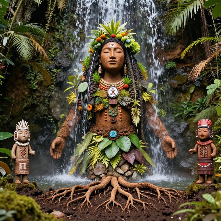 Lush, vibrant Pachamama portrayed as an ethereal figure made of earth, rocks, and plants, with cascading waterfalls forming her hair, roots extending into fertile soil below, encircled by symbols of agriculture and indigenous rituals reflecting ancient reverence.